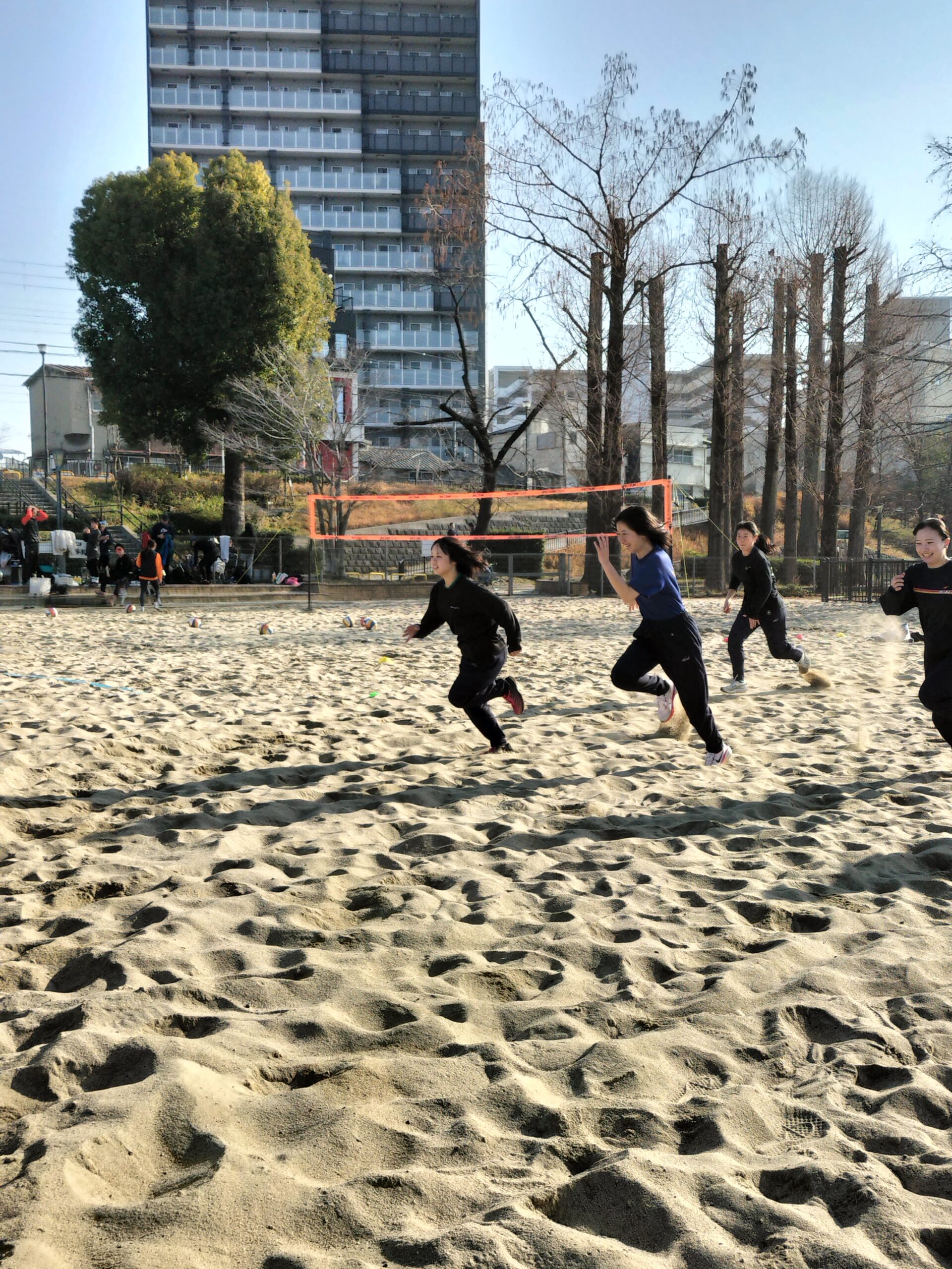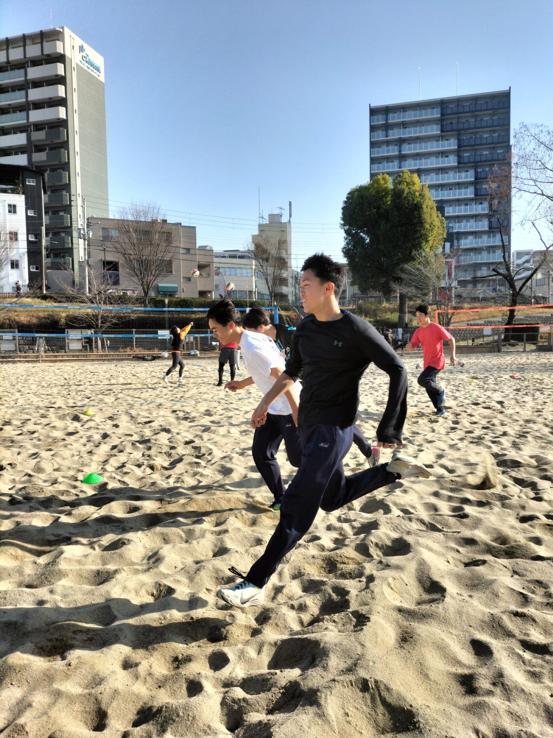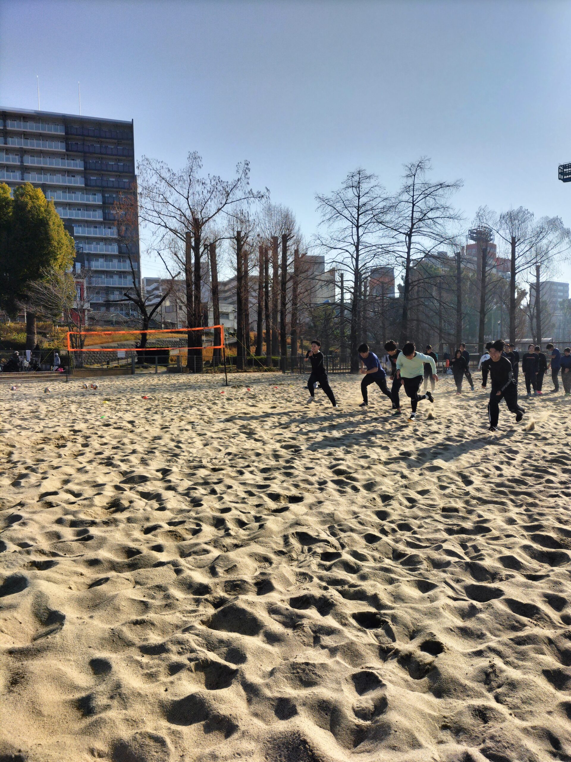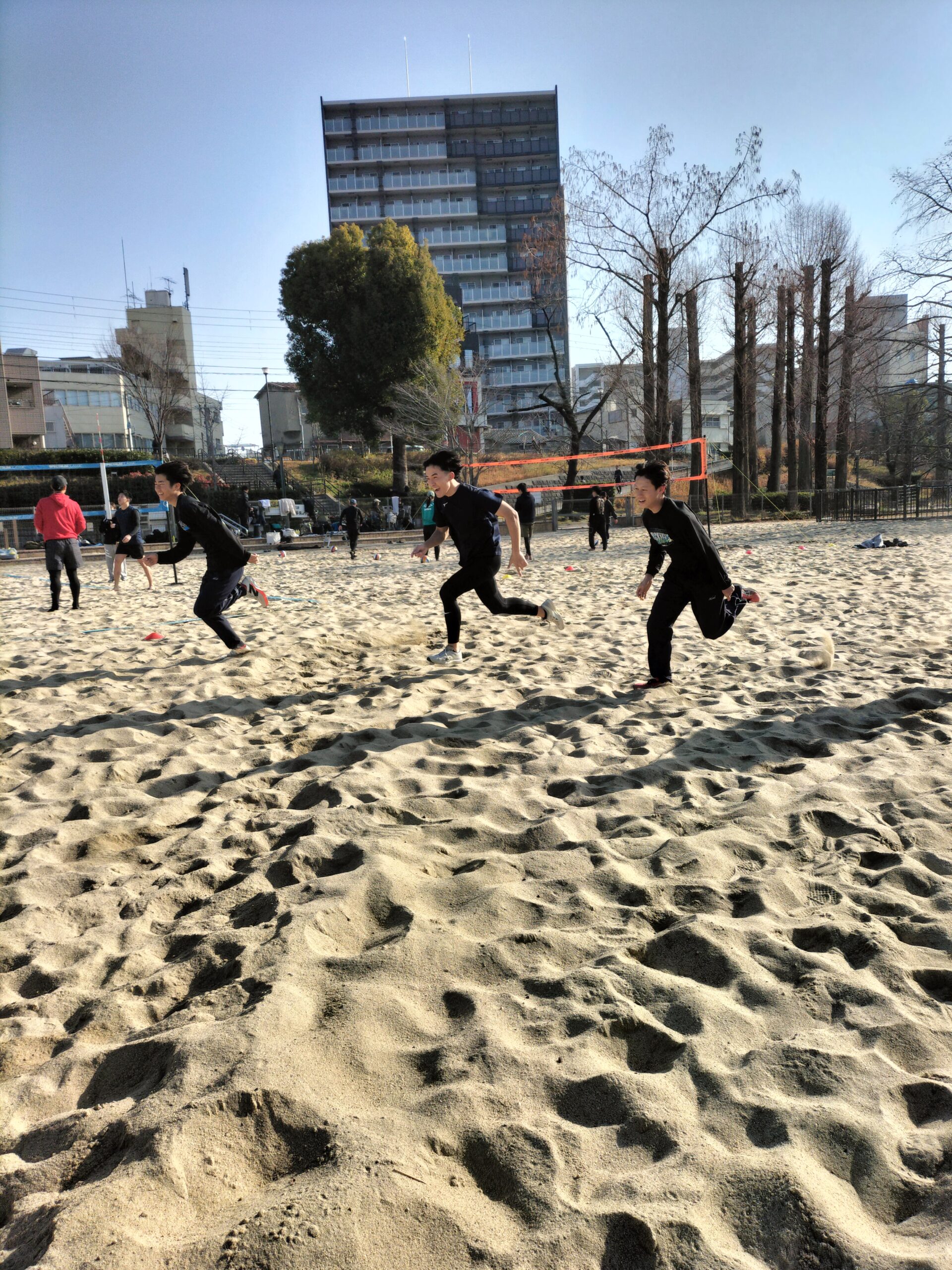 本日は大学入学共通テストの影響で、グラウンドの使用ができなかったため、毎年お世話になっている砂浜での練習となりました。普段学校の土のグラウンド、競技場走路で練習し地面との反発の違いを感じながら行っていますが、ほとんど反発を得られない状況の砂浜での練習は、足裏の振り下ろしだけではいなせない技術的な能力を高める必要があるため、これまで取り組んできた補強や、ドリルが走りに結びついているかを確かめる良い機会となりました。地面を蹴るだけの走りにならないように、身体全身を使って効率よく前に進めるように実感できてほしいものです。あと1週間で卒業試験の3年生も体力的にきつそうでしたが頑張ってやり切ってくれました。何よりも普段と違った環境で楽しそうに走ってる姿が印象に残りました。